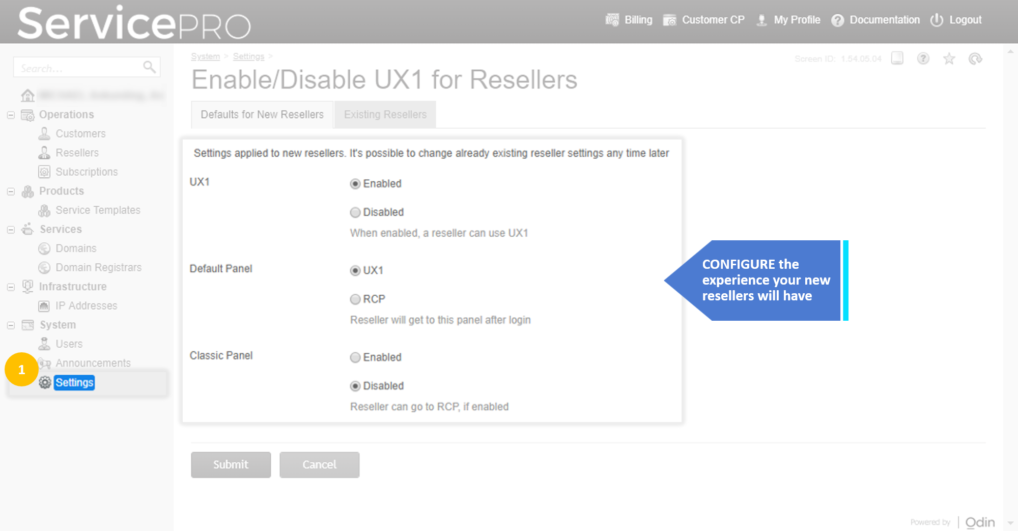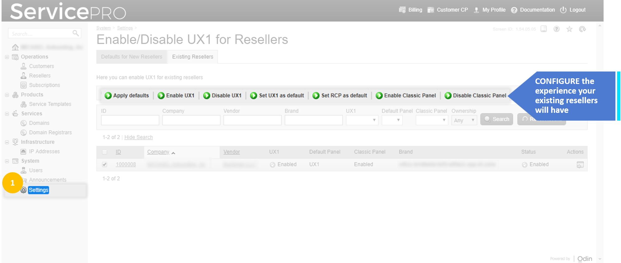 - In Operations RCP, go to System > Settings > Enable/Disable UX1 for Resellers.