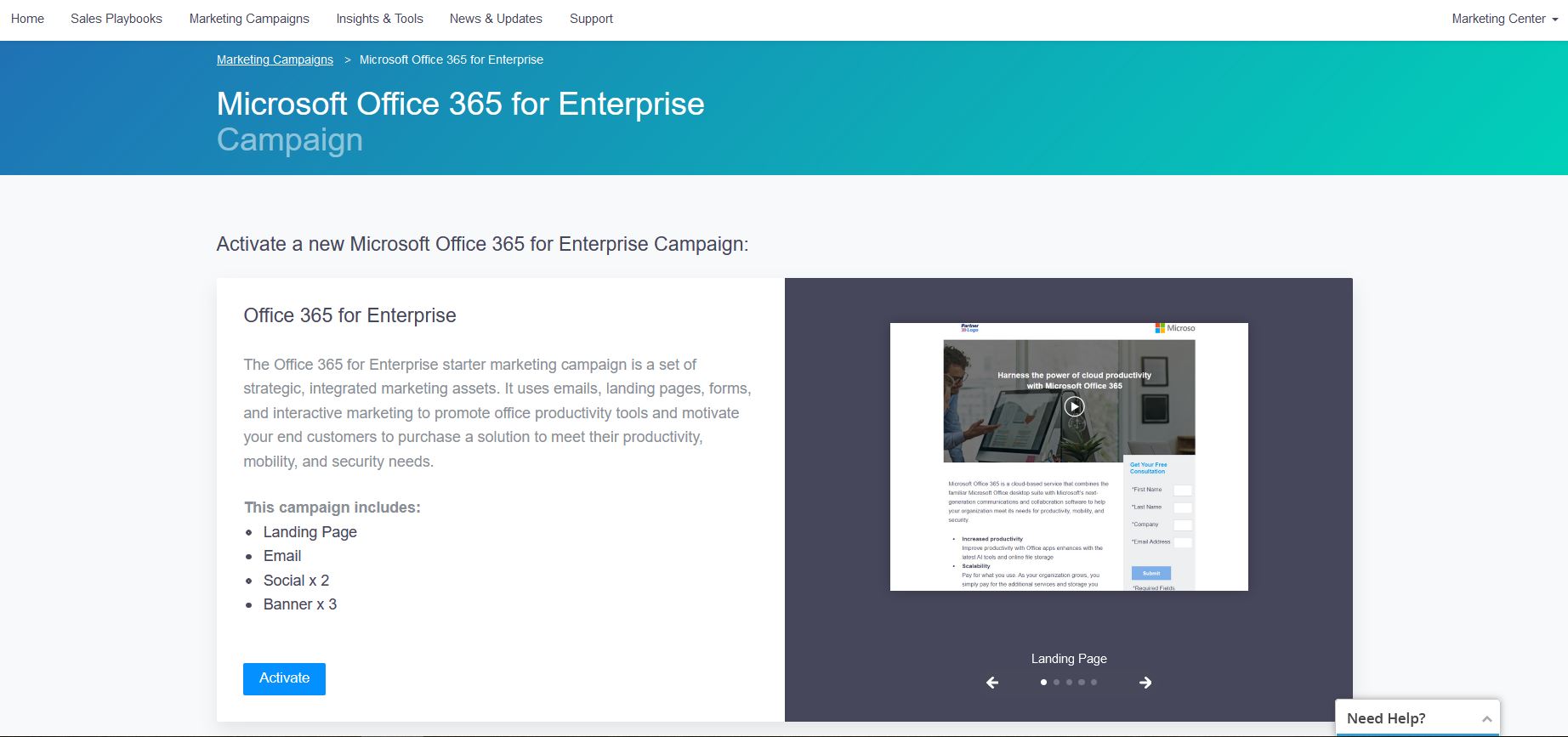 - In the search results, click the tile of the campaign you want to use. From the campaign page, you can view the campaign information, and click Activate to add it to your account.