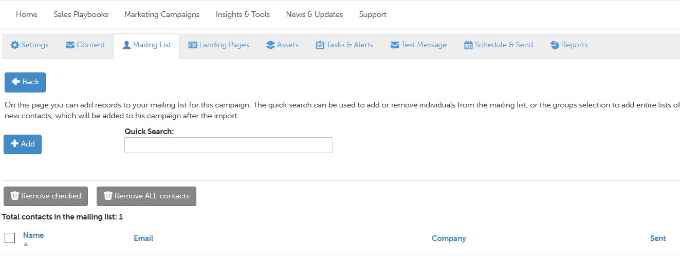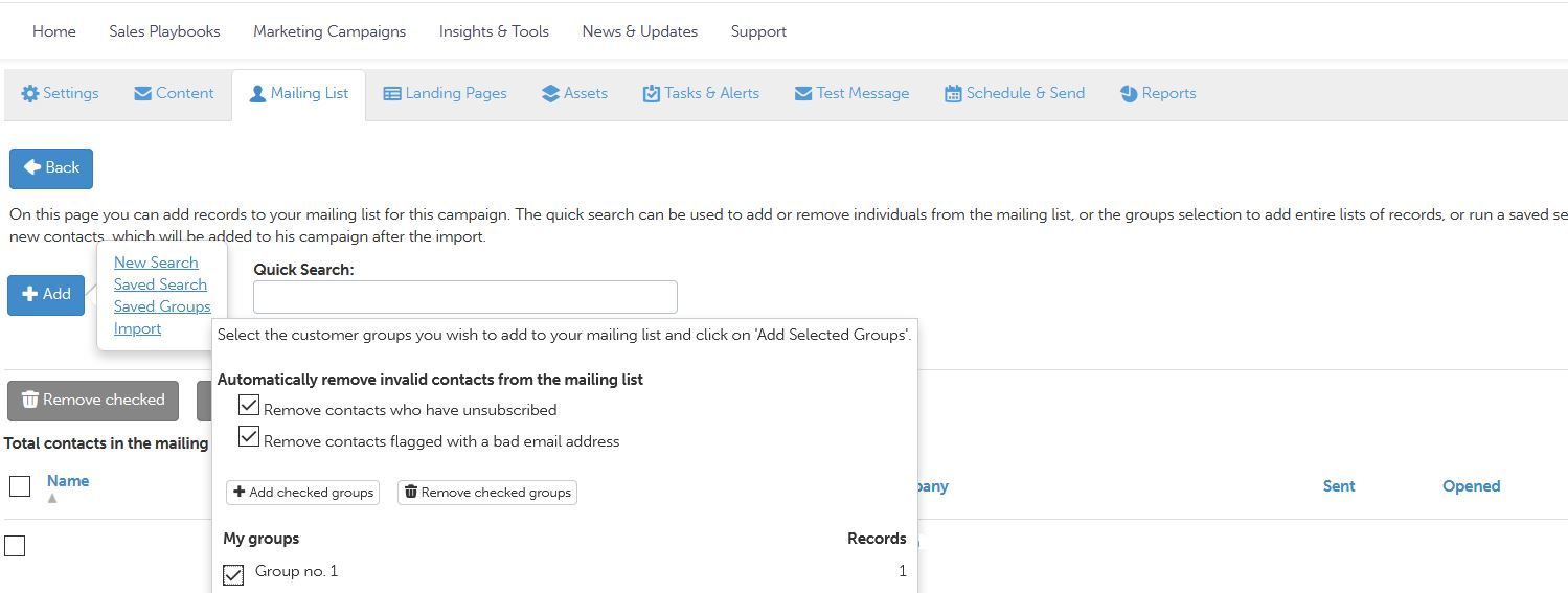On the Mailing List tab, import a mailing list or select a previously created contact group for this marketing campaign email.