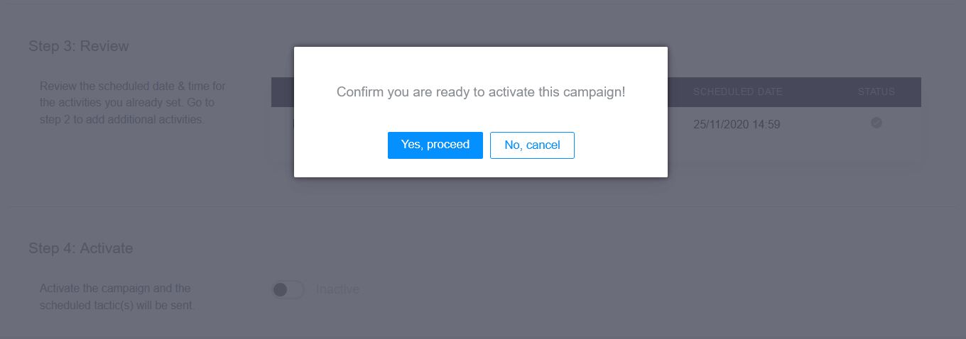 Review the campaign details in Step 3 and click the Activate radio button, then click Yes, proceed in the pop-up window.