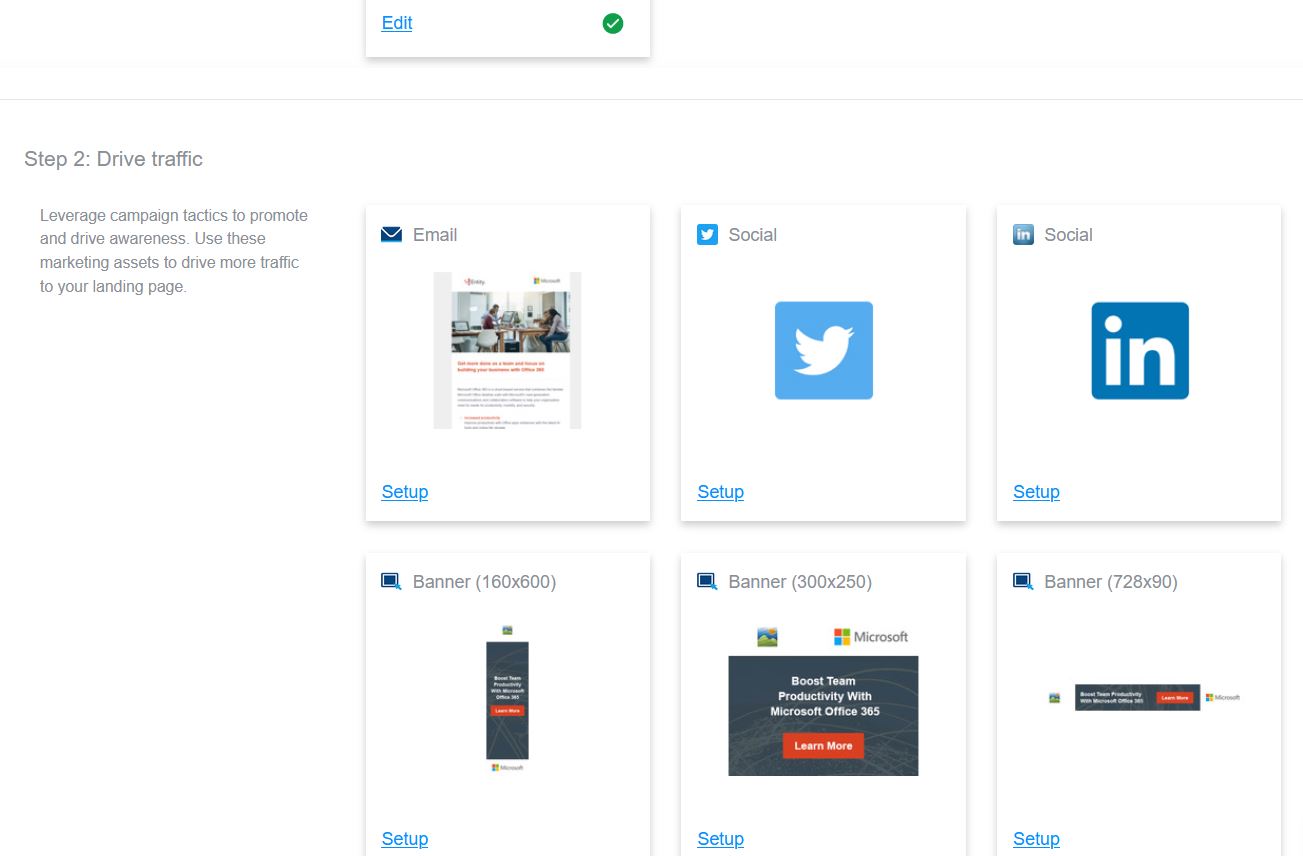 Under Step 2: Drive traffic, click Setup on one of the tiles. For Email, you must add at least one mailing recipient on the Mailing Lists tab and set up the Schedule & Send tab. For other social accounts, you need to authorize the corresponding social media account. You can also customize banners under Step 2.