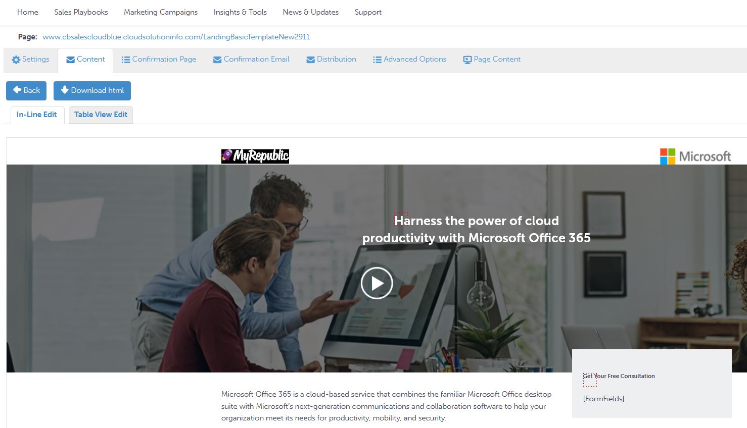 On the Content tab, edit the content of the email using In-line Edit or Table View Edit.