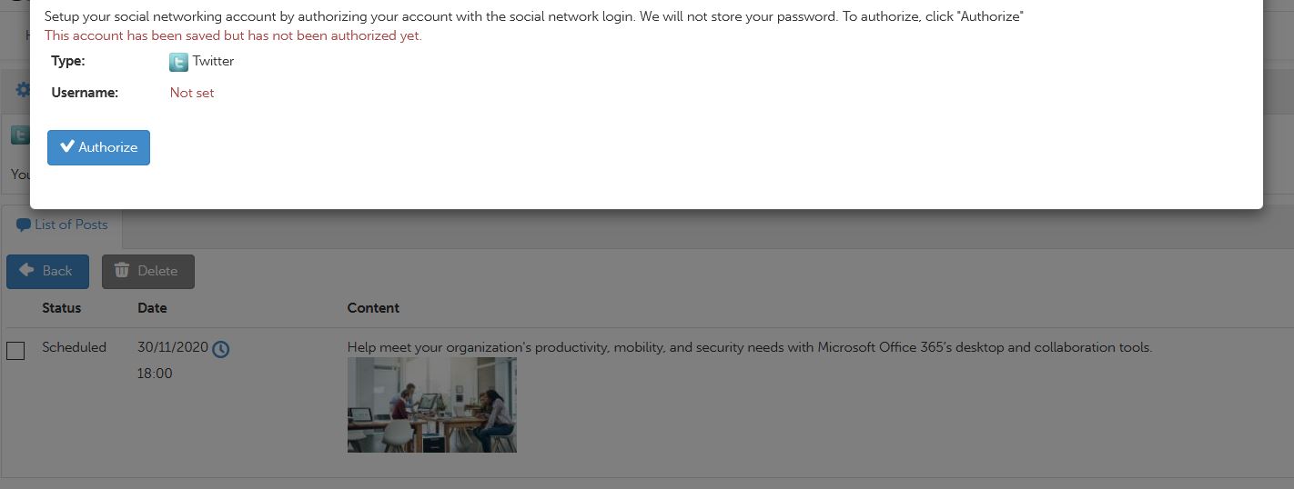 Click Authorize, which will take you to the social page where you will need to enter your social login information to complete authorization of your chosen social account.