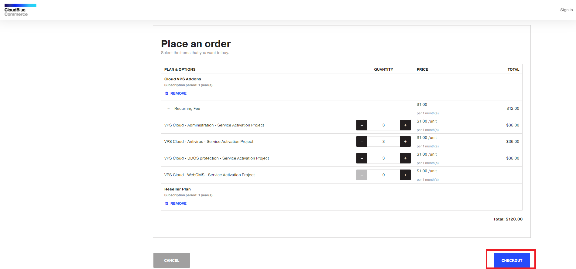 Go to Public Marketplace, add a product to the cart, follow the wizard, and select the items that you want to buy. When you click Checkout, you will be redirected to your external sign-up form.