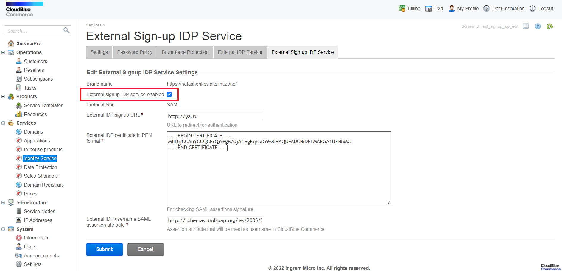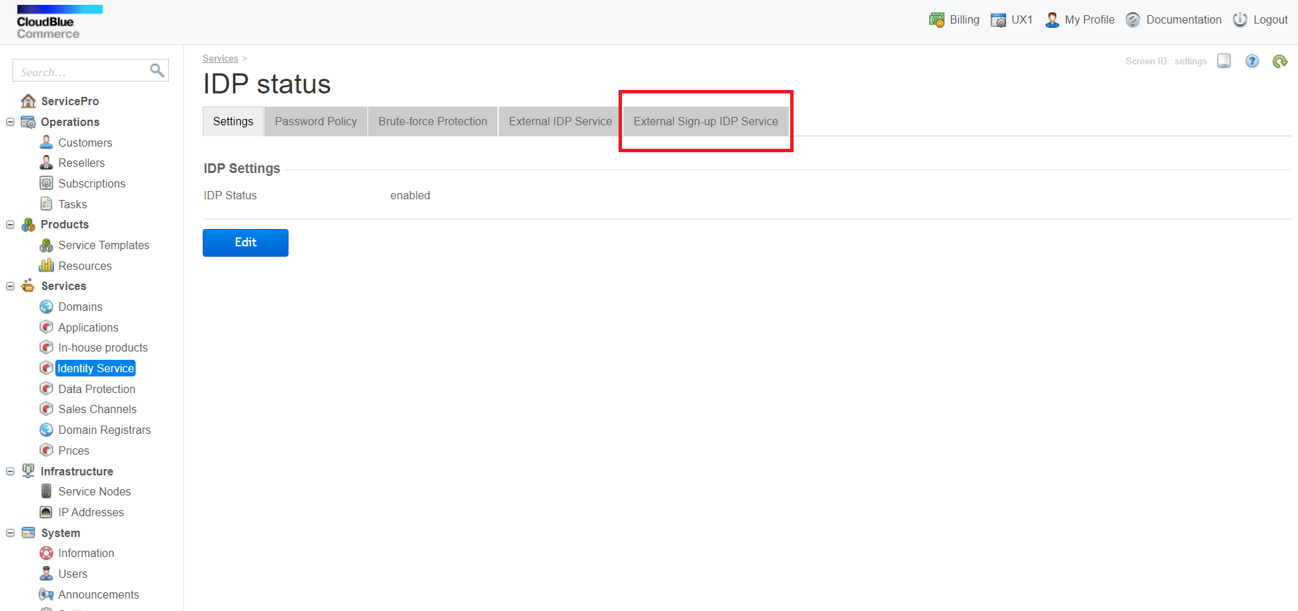 Go to the External Sign-up IDP Service tab in your CloudBlue Commerce classic panel.