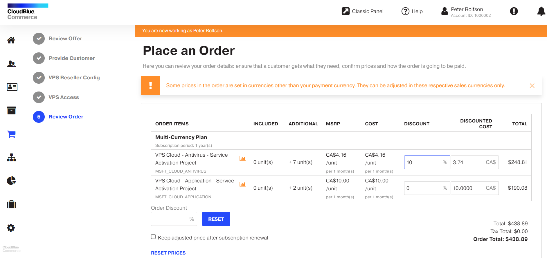 If as a provider or reseller, you use the Adjust Prices functionality, at the last step of checkout wizard you will see a notification that prices can be adjusted in the original sales currency only. Here you can also hover over the chart icon to preview prices in both currencies and see the exchange rate that was used for prices calculation.