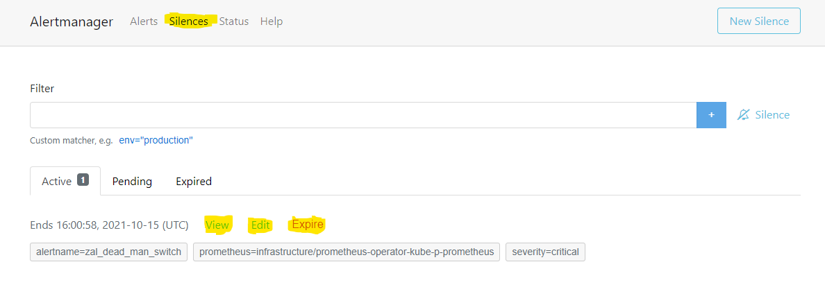 In the Alertmanager UI, in the top menu, click the Silences link.