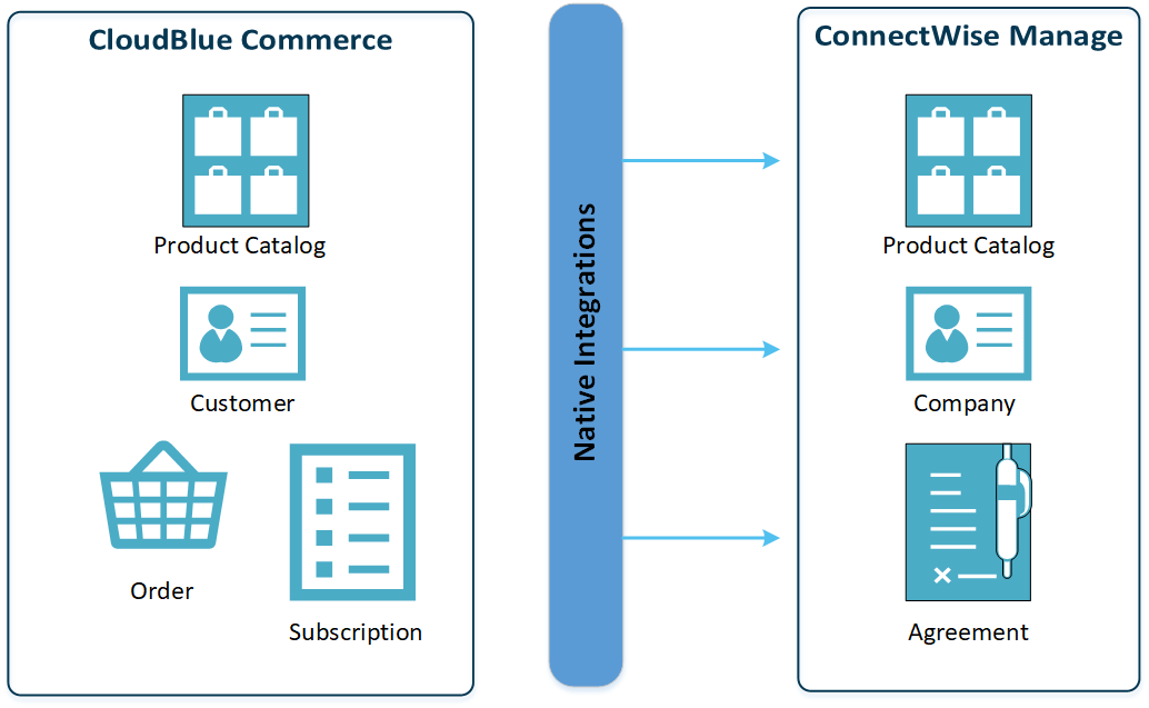 To ensure that there are no mismatches, and all changes in Reseller Marketplace are synchronized with ConnectWise, the objects in both systems must be mapped. That is, Reseller Marketplace Product Catalog, Customer Catalog, Order and Subscription must be mapped with the respective ConnectWise objects: Product Catalog, Company, and Agreement.