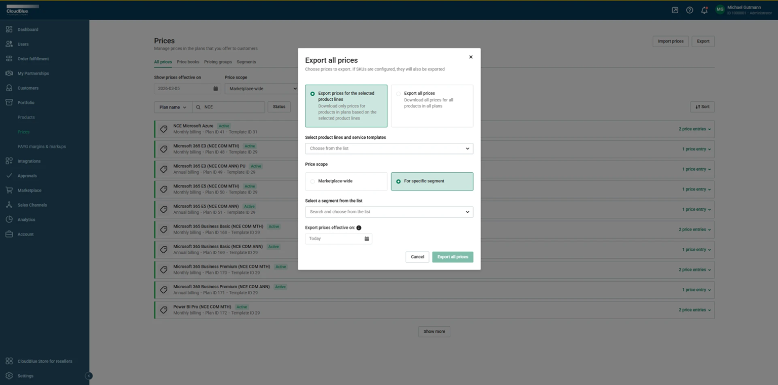 For specific segment. This will export only the prices effective for the selected segment. For this mode, you also need to select the segment for which to export the prices.