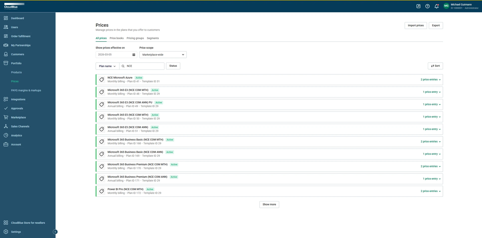 All prices are displayed under Portfolio > Prices in UX1. They are displayed in collapsed blocks, each block referring to a plan. For each plan, the number of its price entries is displayed.