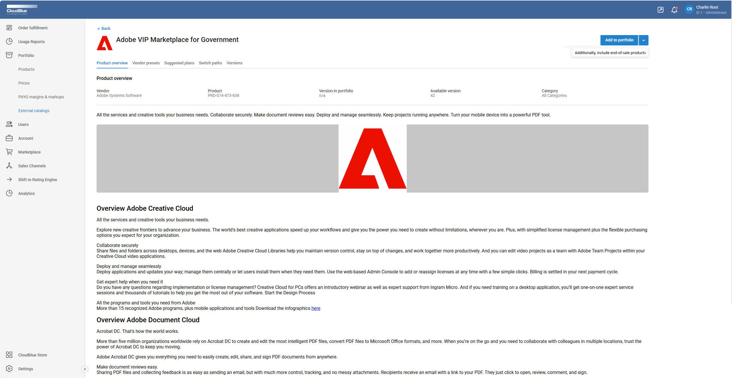 Now, to update your portfolio, you can go to UX1 > Portfolio > External Catalog, find the product or plan you need, review and adjust its configuration, if necessary, and add it right away. CloudBlue will transform Connect data into the Commerce configuration, updating your portfolio. This change eliminates the need to create PPRs manually and drastically accelerates product onboarding.