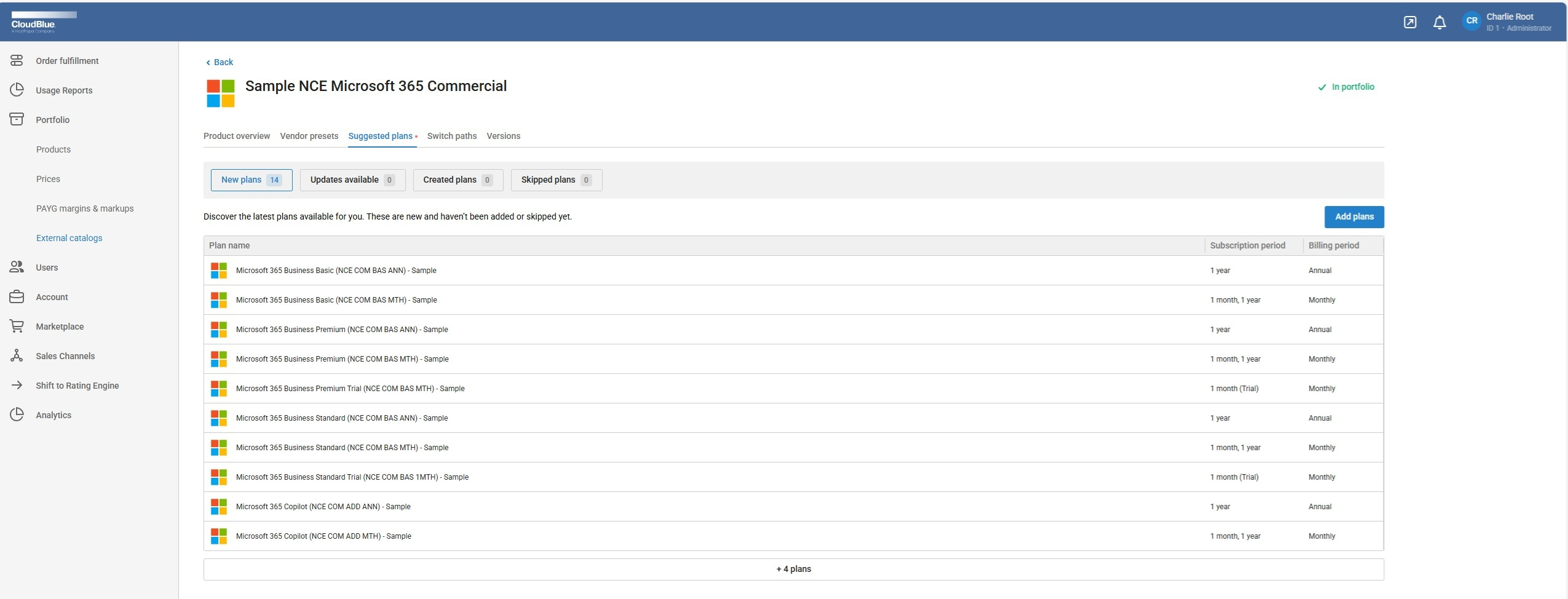 CBPFR-230, CBPFR-934, CBPFR-1471 Starting with this version, you can create and maintain your portfolio in CloudBlue Commerce using vendor-recommended product-related data from Connect, which includes products, plans, plan presets, switch paths, switch path presets, and localized descriptions.