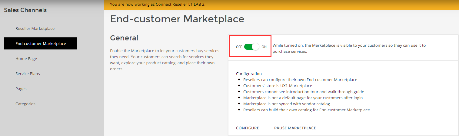 Login to UX1 for Resellers. Navigate to Sales channels > End-customer marketplace