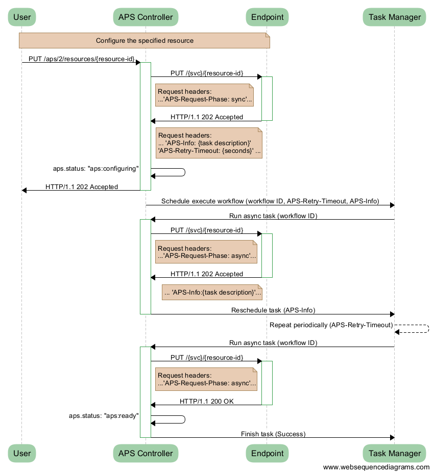 The APS controller calls the task manager of the hosting platform to schedule a workflow and set its timeout equal to APS-Retry-Timeout. In accordance with this workflow, the task manager must wake up the APS controller to initiate the asynchronous request.