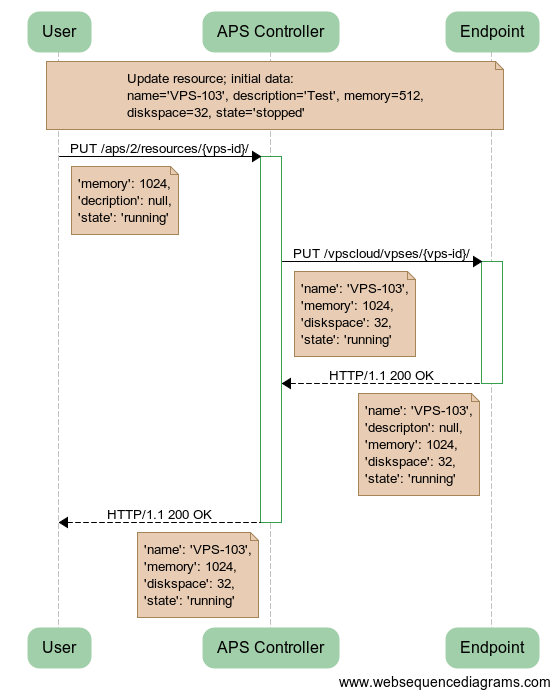 In the following example, let us assume that the VPS resource has only five properties, whose initial values were: name = ‘VPS-103’, description = ‘Test’, memory = 512, diskspace = 32, state = ‘stopped’.