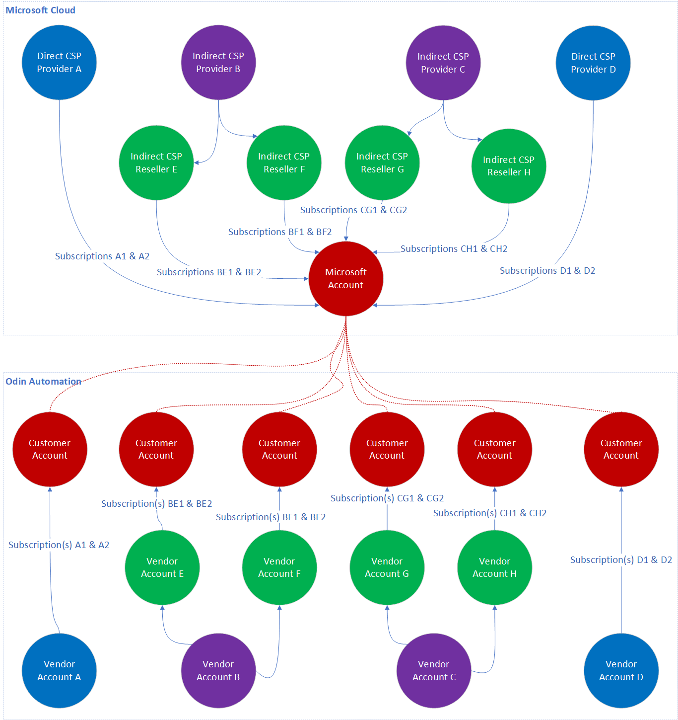 Within an Odin Automation instance, several Direct and Indirect CSP Providers can be represented as vendor accounts. Indirect CSP Resellers can also be represented as vendor accounts subordinate to the respective vendor accounts of their Indirect CSP Providers. A customer that has an account in the Microsoft cloud can be represented as several customer accounts subordinate to different vendor accounts.