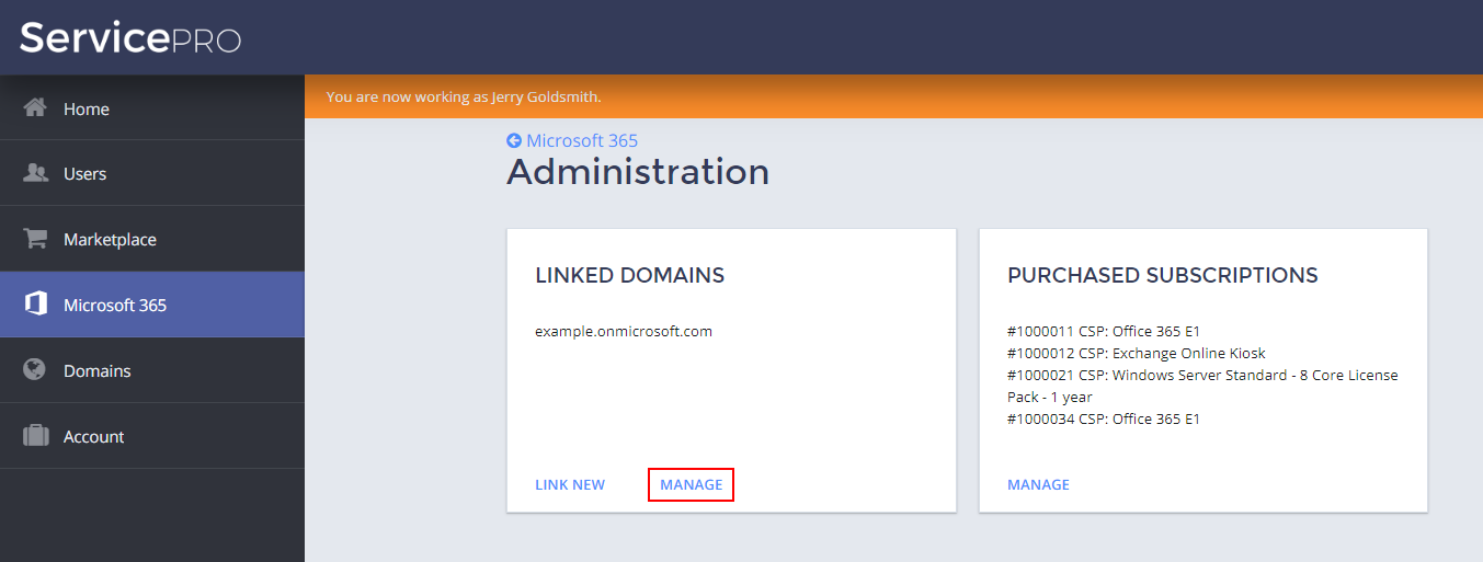 (Administration Screen, LINKED DOMAINS Tile) MANAGE Button