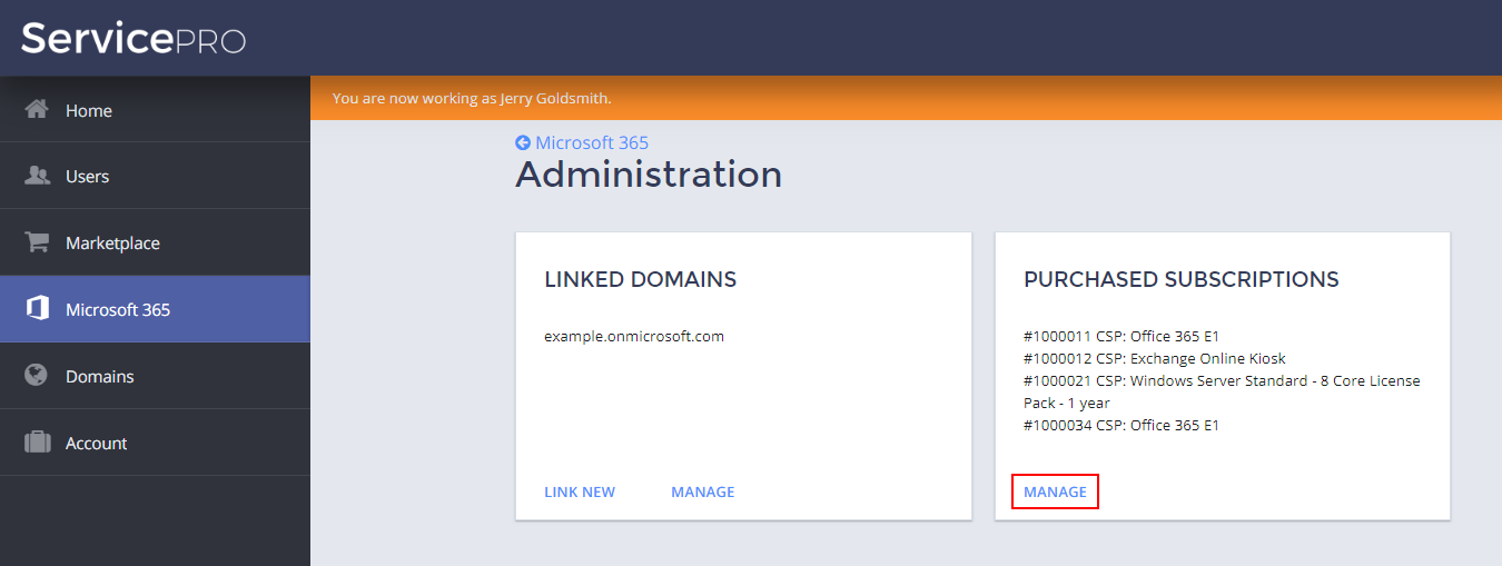 (Administration Screen, PURCHASED SUBSCRIPTIONS Tile) MANAGE Button