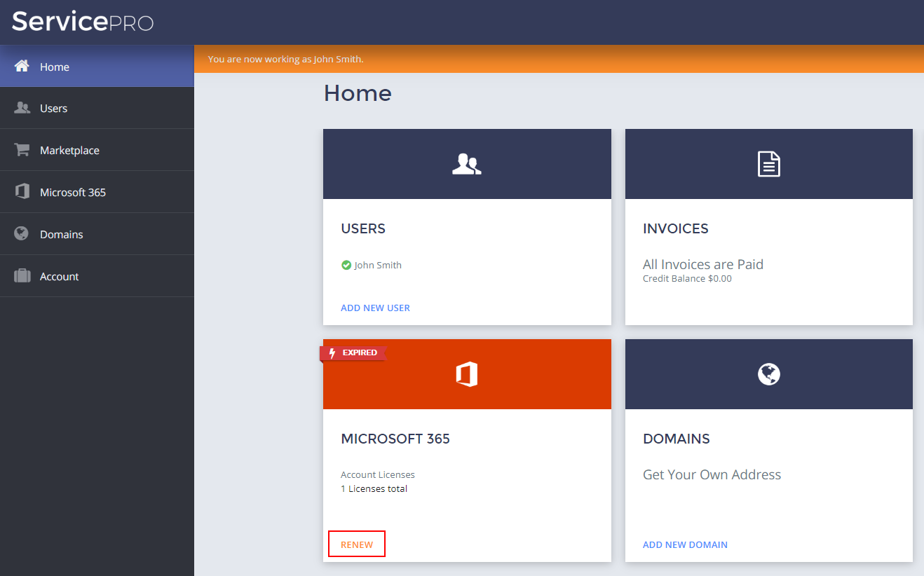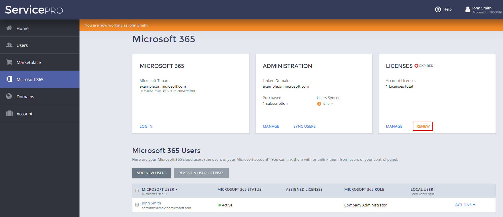 (Microsoft 365 Screen, LICENSES Tile) RENEW Button