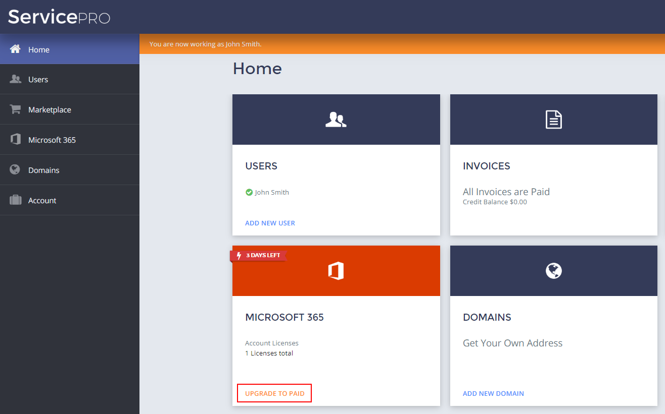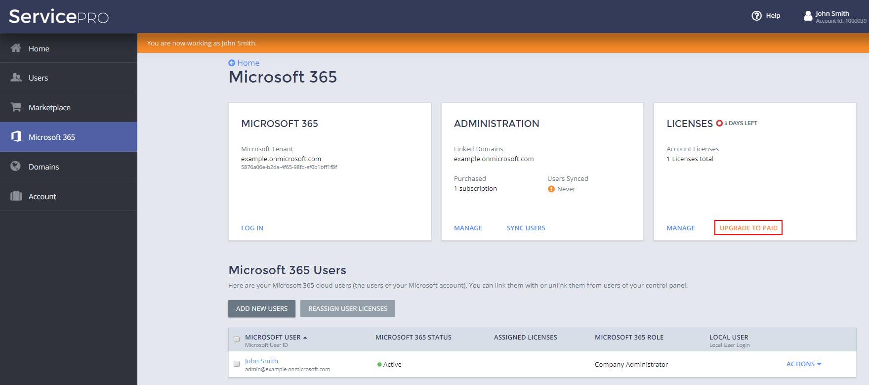 (Microsoft 365 Screen, LICENSES Tile) UPGRADE TO PAID Button