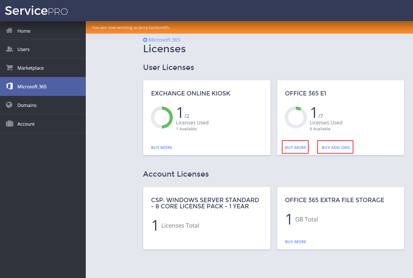 (Licenses Screen, License Tile) BUY MORE and BUY ADD-ONS Buttons
