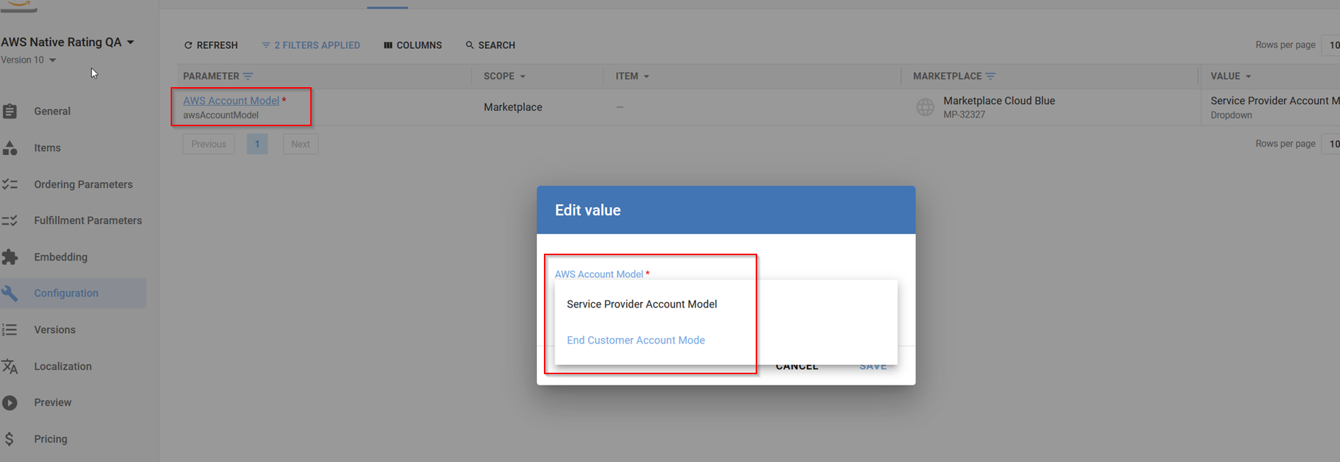 To define the business model you must use the AWS Account Model marketplace configuration parameter in Connect.