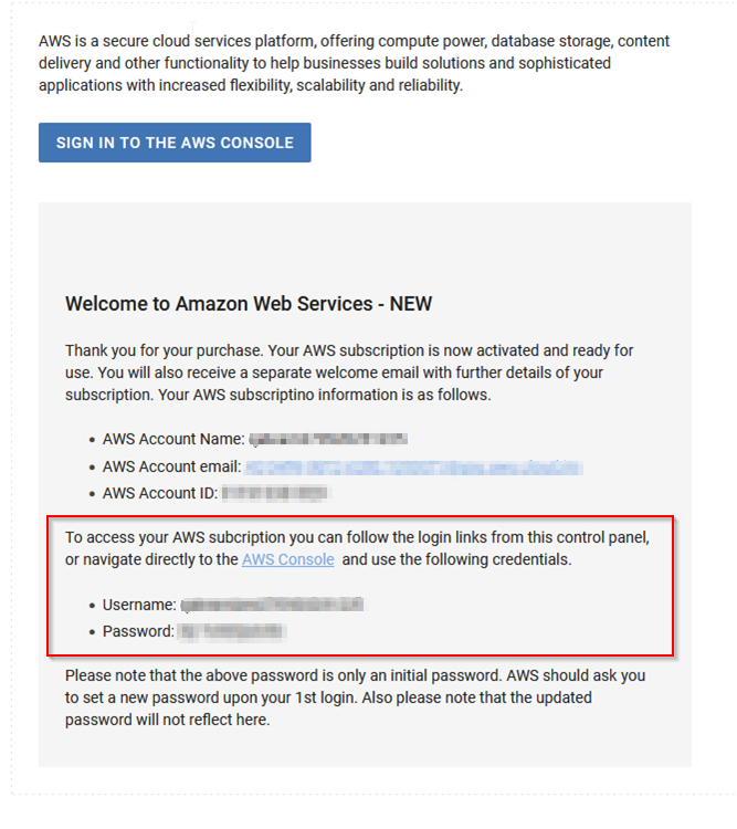 If an IAM user was generated for the end-customer, the subscription information displayed to the end-customer will include the AWS IAM User created by the connector with the relevant SCP applied. To display this template, the provideRootUserForECAM parameter must be set to No. This is configurable at marketplace or OPCO level.