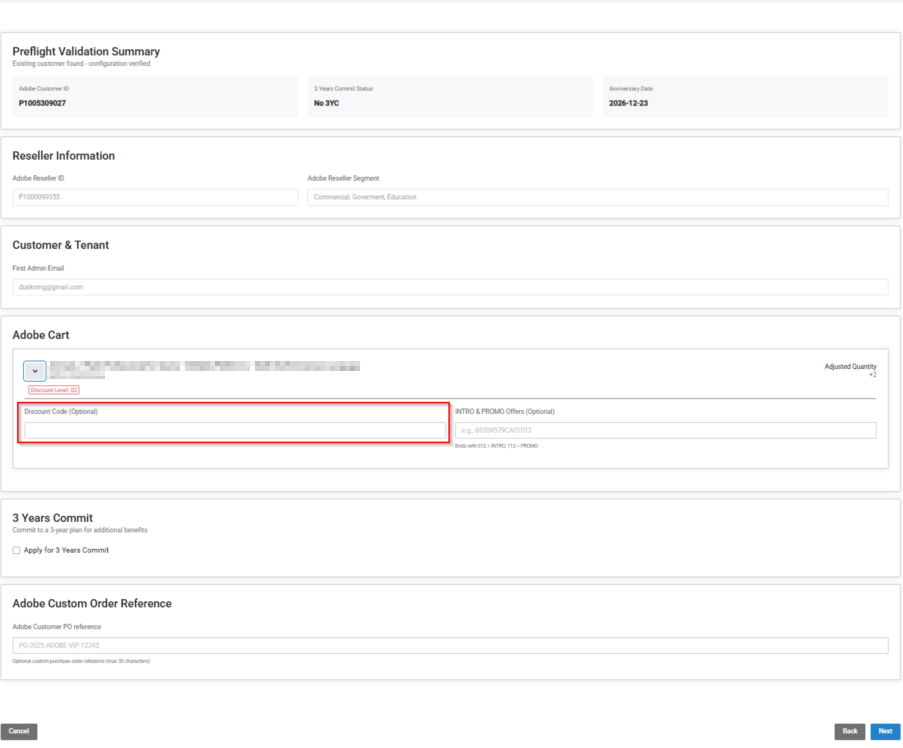 • Validation: The connector uses the Adobe Order Preview API to confirm the validity of all Base Offer IDs and their associated discount codes.