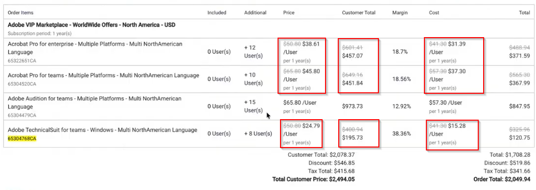 Once the discount code is provided, CloudBlue calculates the eligible discounts and shows the discounted price, customer total and cost in the Checkout screen.