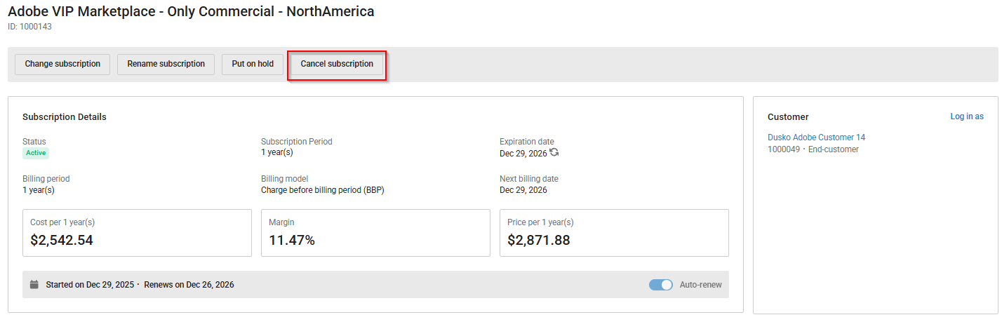 Important: Canceling a subscription is not a recommended procedure. To obtain additional information about the cancellation of subscriptions, see the following article: Managing Adobe Products on the CloudBlue Marketplace: Order Returns, Upsizing, Downsizing