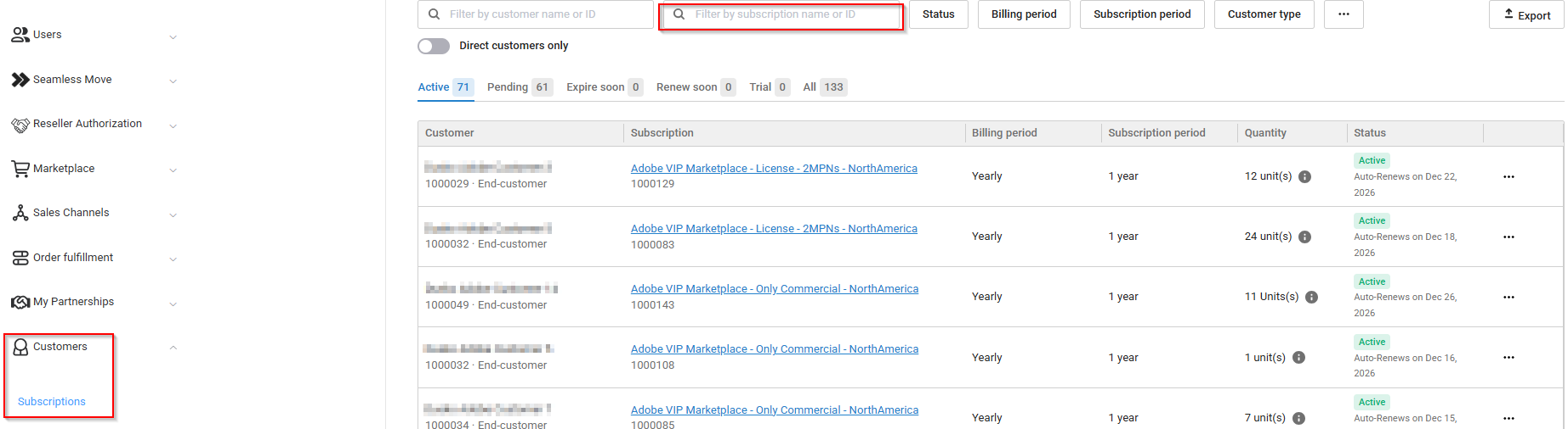 Click Customers > Subscriptions and find the customer and the subscription.