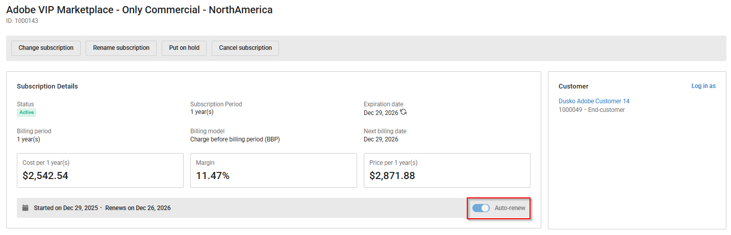 In the case of Adobe VIP Marketplace subscriptions with a 3-year commitment, auto-renewal is enforced for the first two cycles. Disabling auto-renewal is only possible during the last cycle of the 3-year contract. To disable auto-renewal, complete the following steps: