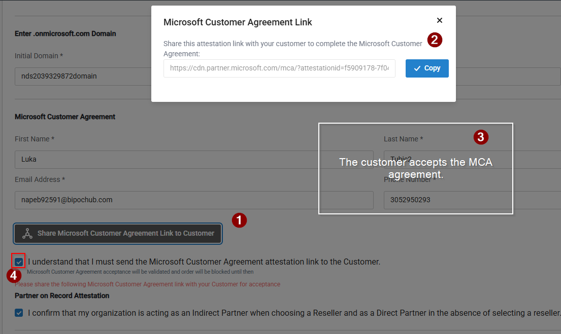Once the customer accepts, select the checkbox: I understand that I must send the Microsoft Customer Agreement attestation link to the Customer to proceed with the order.