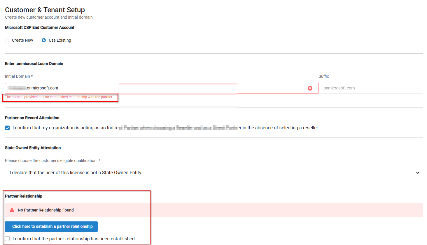Confirm that the customer partner authorization has been completed by selecting the following checkbox: I confirm that the partner relationship has been established.