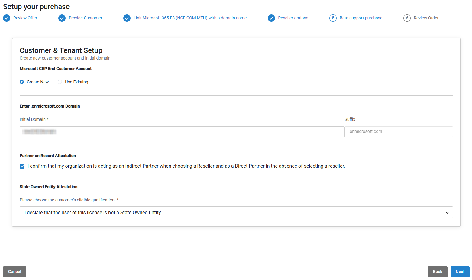 Confirm the Partner on Record (POR) attestation. This is a legal confirmation required for partners transacting in the Cloud Solution Provider (CSP) program. This statement is designed to ensure legal clarity regarding your role in a specific transaction. To do this, select the following checkbox: I confirm that my organization is acting as an indirect Partner when choosing a reseller and as a Direct partner in the absence of selecting a reseller.