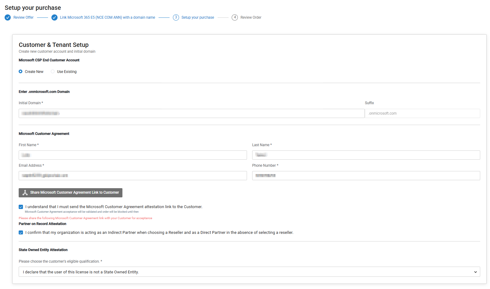 Once the agreement is accepted, select the checkbox: I understand that I must send the Microsoft Customer Agreement attestation link to the Customer to proceed with the order.
