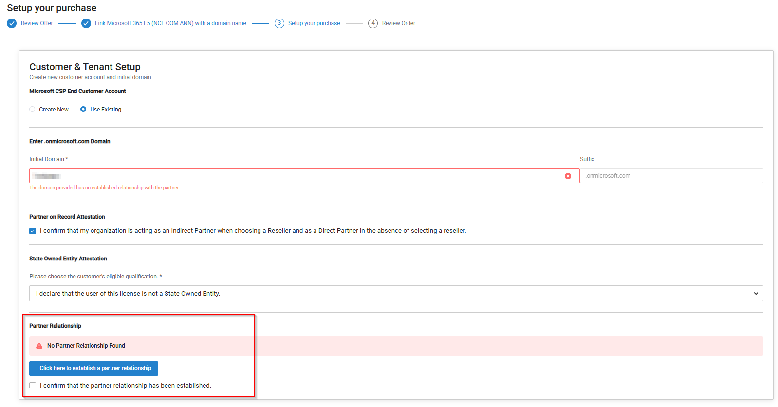 Confirm that the customer partner authorization has been completed by selecting the following checkbox: I confirm that the partner relationship has been established.