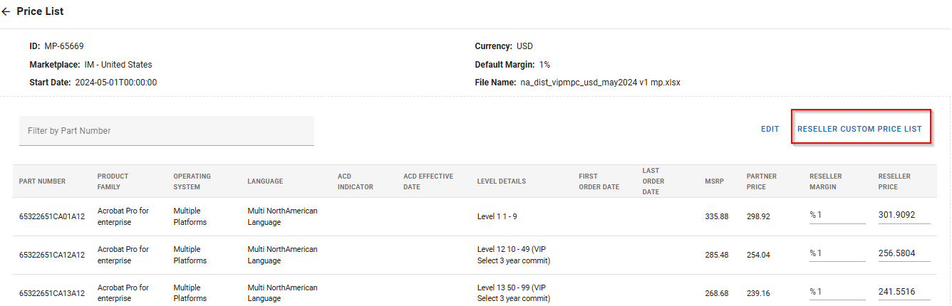 You can create or edit a custom price list for a particular reseller, where you can configure different margins for the different products. To do this, complete the following steps: