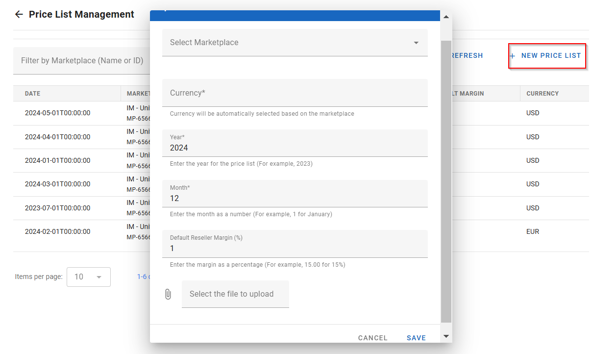 Select the marketplace, the year, the month and the default reseller margin to be applied to all the products. The currency will be automatically selected based on the marketplace.