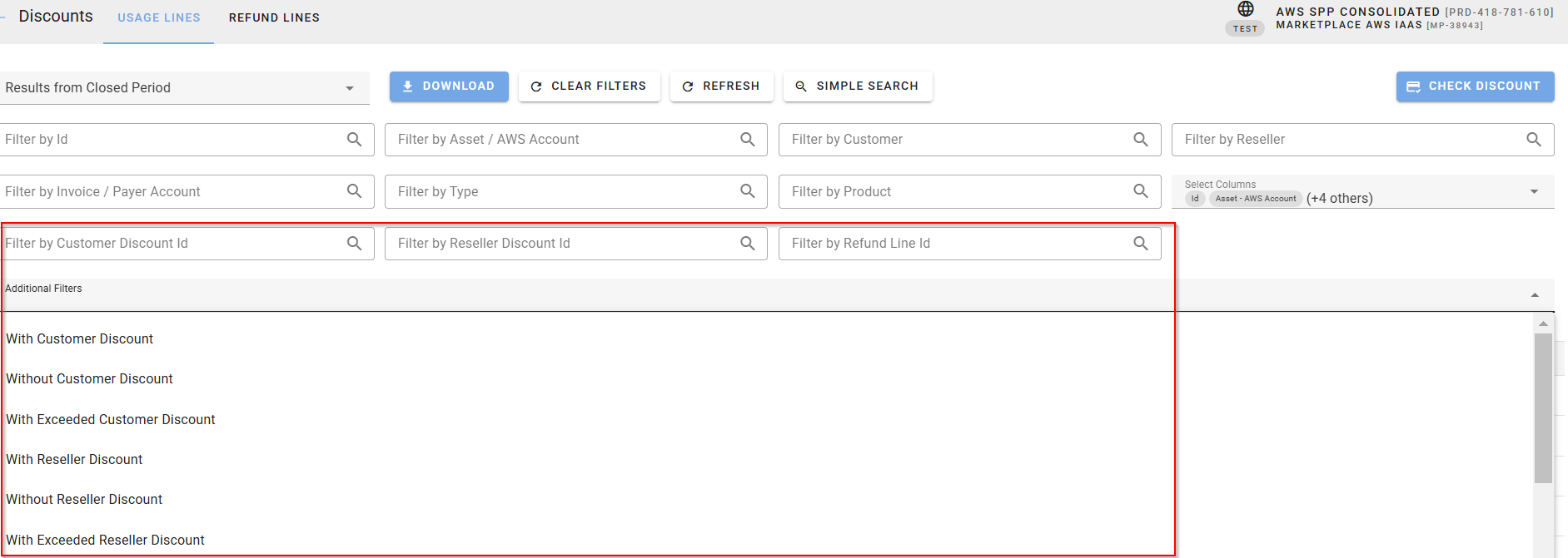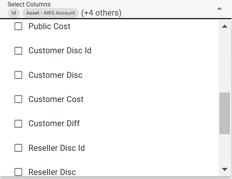 Customize columns: Add more columns via the Select Columns field to display additional details, such as customer and reseller discount IDs.