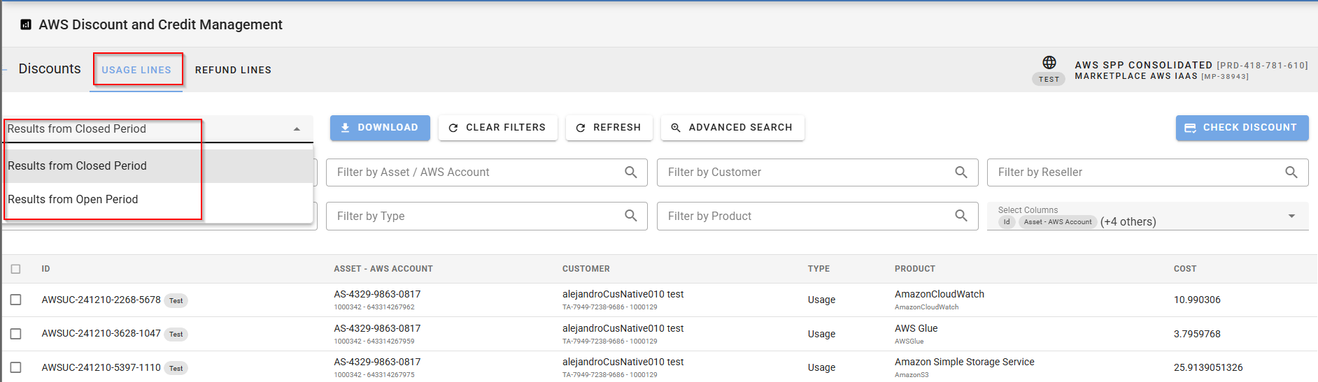 Navigate to the Usage Lines tab to view all charges retrieved from AWS CUR. You can: