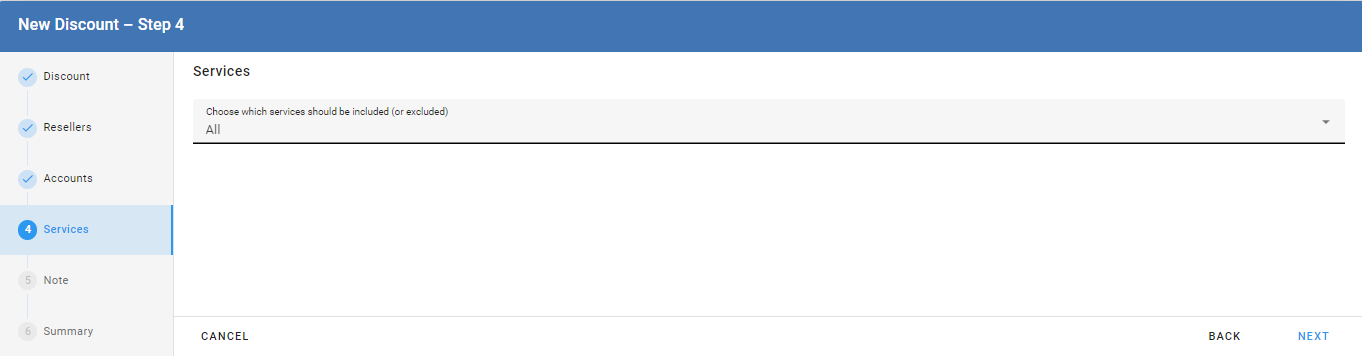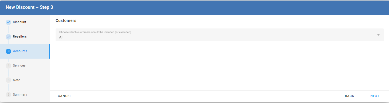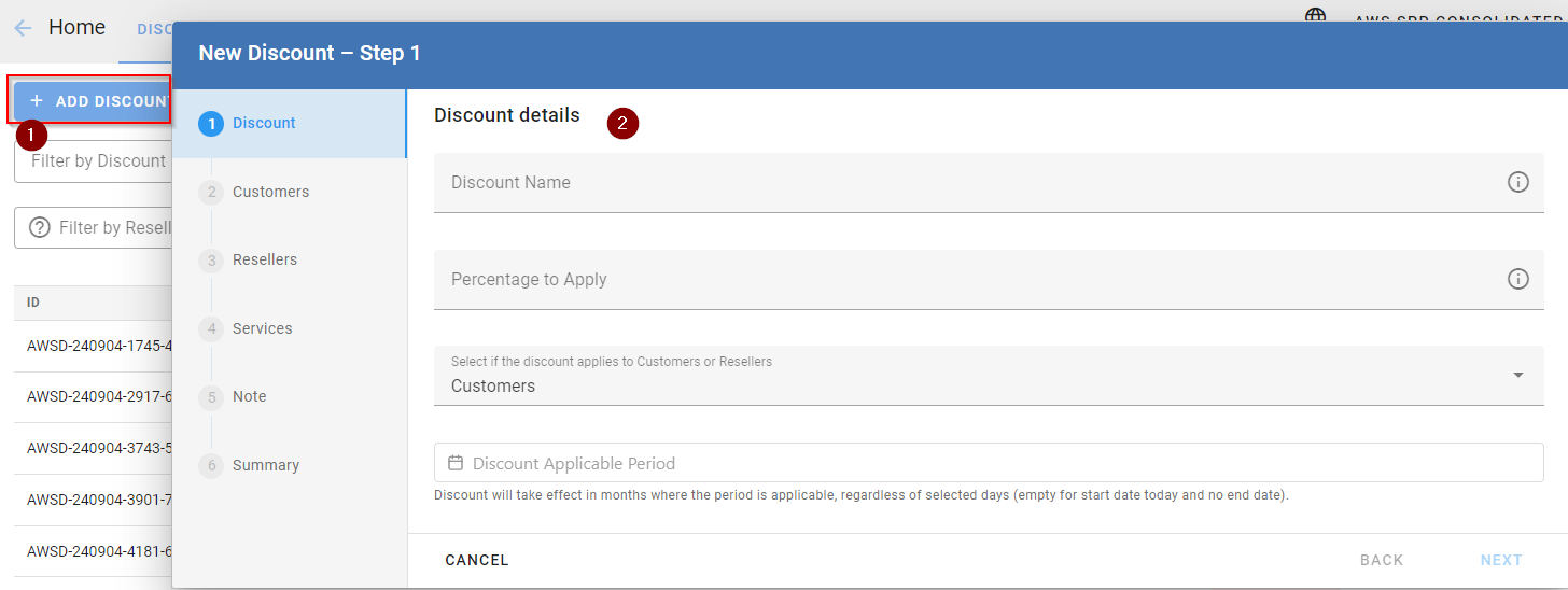 Click Add Discount. Then, enter a name for the discount, the discount percentage and specify if the discount will be applied to customers or resellers. You can leave the Applicable Period field empty if you do not want to specify an end date for the default discount. Click Next.