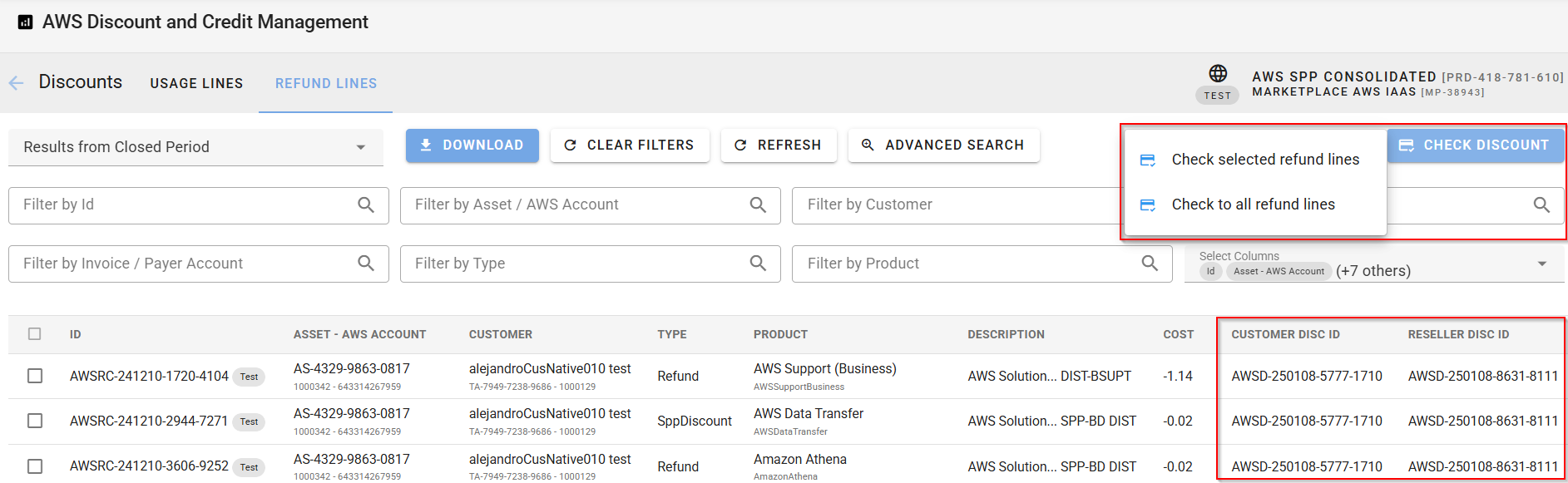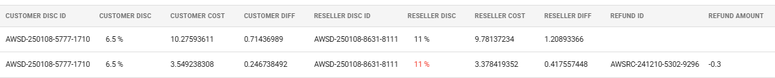 Review Discount Rule Matching: The system matches discount rules based on the AWS ID and service, from most to least granular. The matched rules are shown in the Customer Discount ID and Reseller Discount ID columns. This allows you to see the discounts that will be applied by the discount rule and compare them with the refunds received from AWS for each of the usage lines.