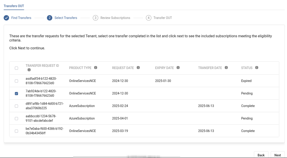 You can either select an outbound transfer in Pending status to approve the outbound transfer request or choose a transfer in Completed status to create cancellation orders for the subscriptions included in that transfer. Click Next.