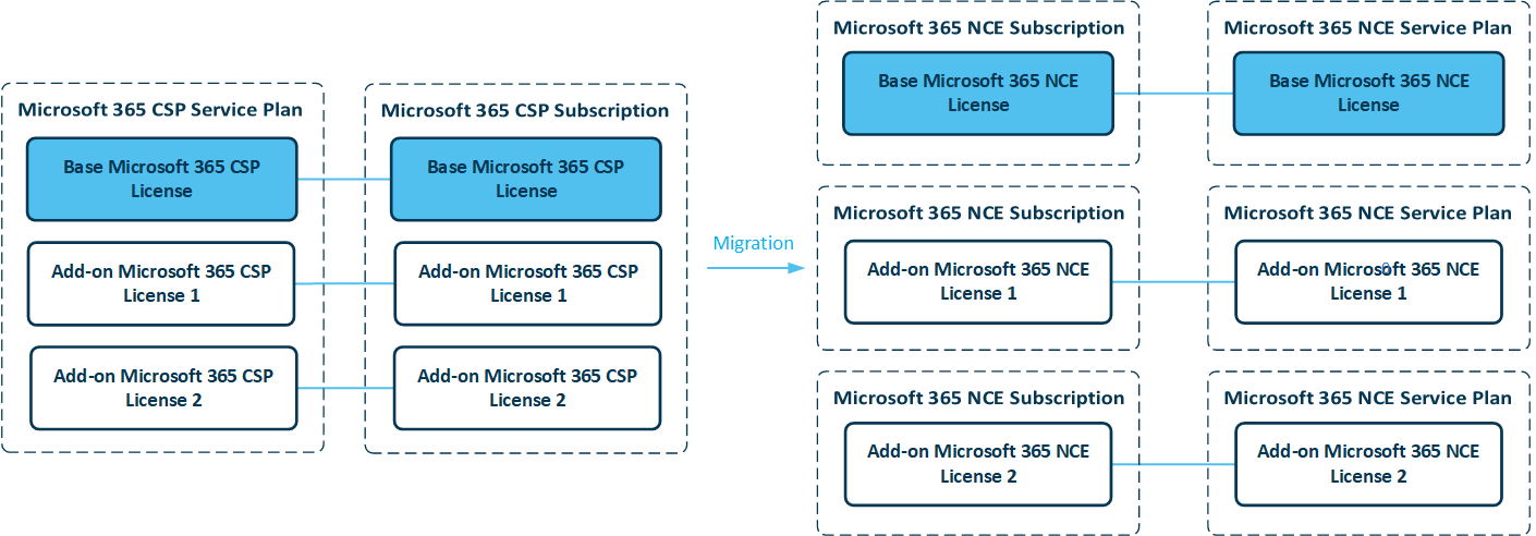For each Microsoft 365 CSP license of that subscription, there must be a separate Microsoft 365 NCE service plan with the appropriate Microsoft 365 NCE license.