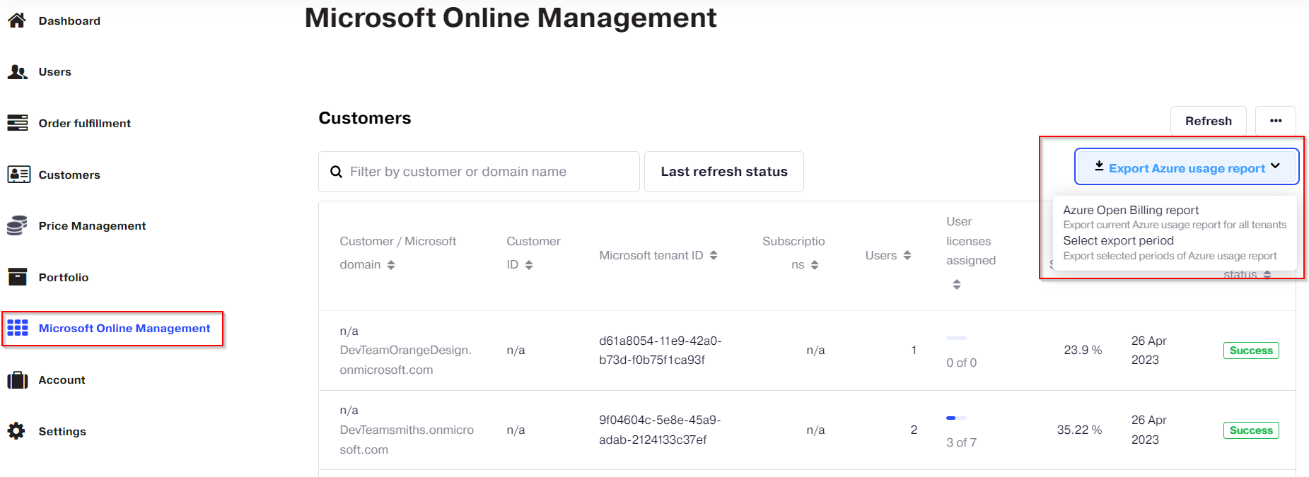 Click the Export Azure Usage Report button. Then, select one of the following options available: