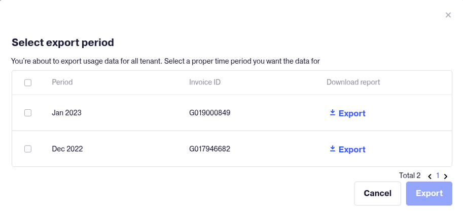 To download several closed billing period reports at the same time, select the corresponding checkbox and click the Export button.