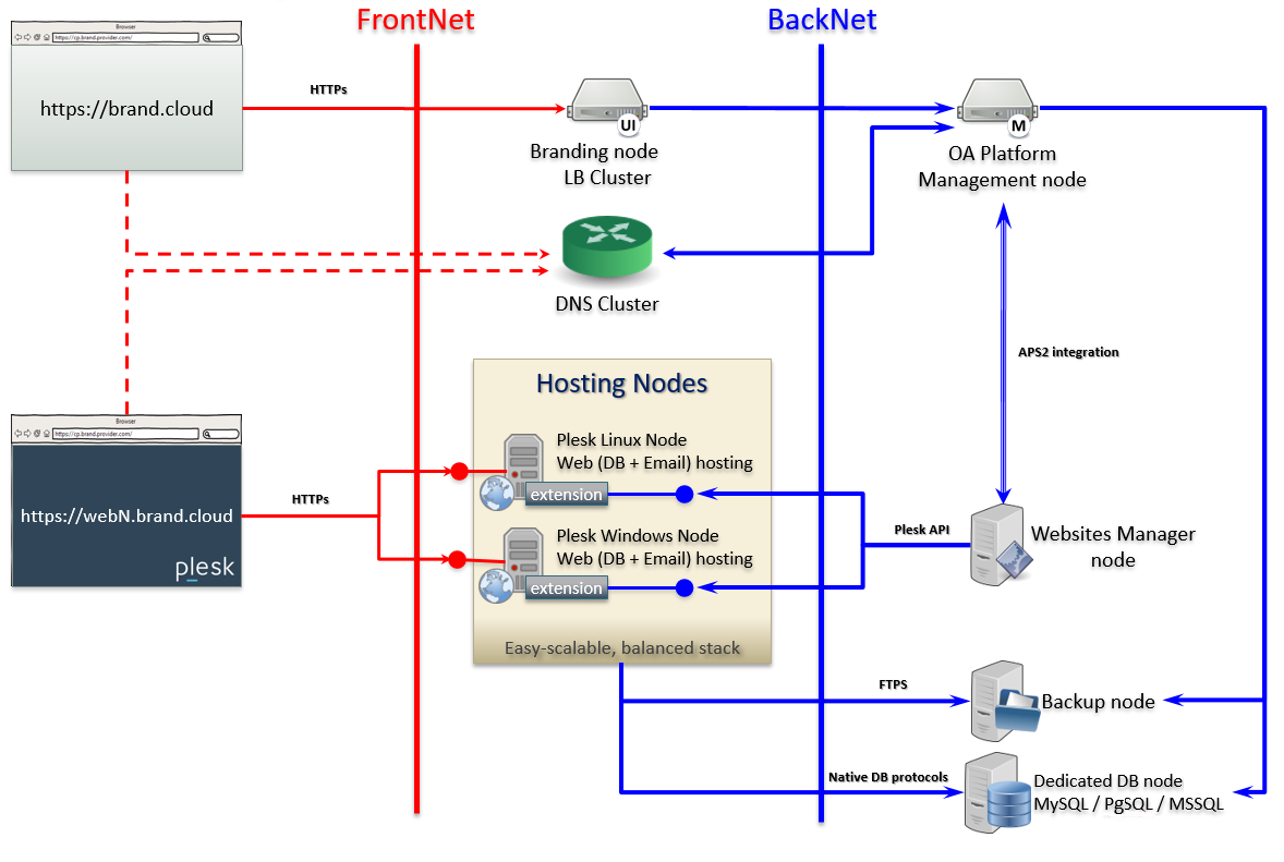 To deploy the WebHosting Plesk Module for Odin Automation, you need one or more servers that will host user data (service nodes), and a Websites Manager node that will host additional software components required for the communication of all system components. The figure below illustrates a typical organization of hosting infrastructure based on Odin Automation.