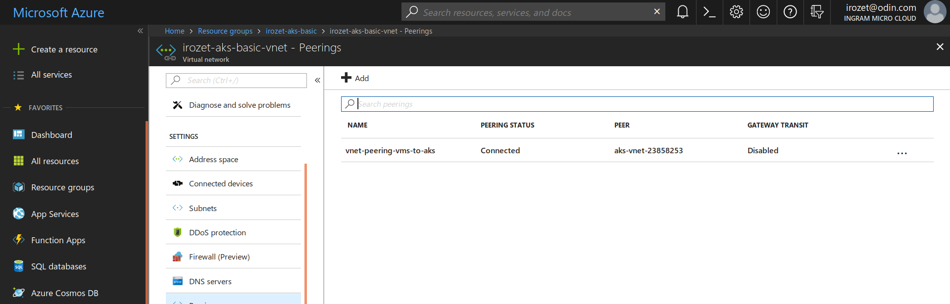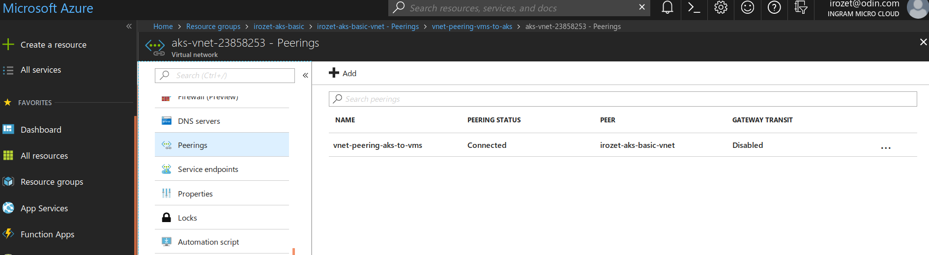 Note: For a Basic AKS network in Azure, to ensure connectivity between the VPN load balancer and VPN clients installed to Odin Automation Management Node and UI nodes, it is necessary to configure VNet peering between AKS and the Odin Automation Management Node VNet in both directions: from AKS to the MN VNet and from the MN VNet to AKS.