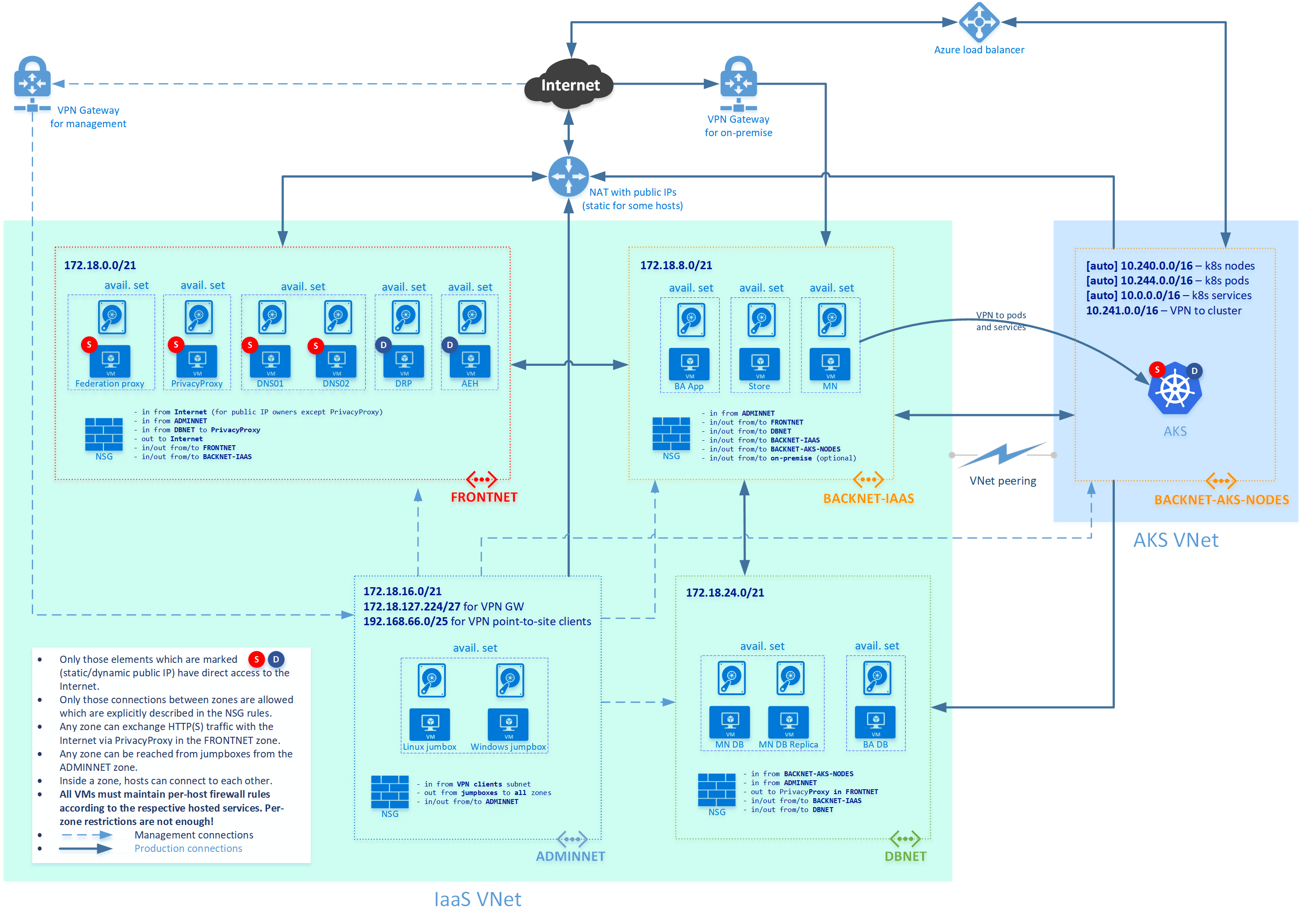 For the deployment of Odin Automation to Azure cloud, the diagram below shows a reference Azure cloud infrastructure deployment scheme. For more detail on the diagram, please see Hardware and Software Requirements.